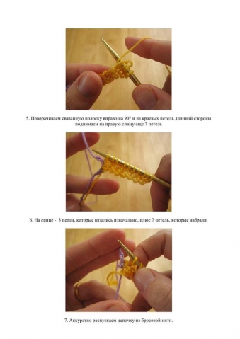 Вяжите 6 рядов платочной вязкой-все петли во всех рядах провязывать лицевыми.После последнего ряда не разворачивайте работу,держите спицу с провйцом к себе,поверните вязание по часовой стрелке на 90 градусов.Подхватите и провяжите из кромочных петель по краю провязанного полотна 3 петли.Снова поверните изделие на 90 градусов по часовой стрелке,подхватите на спицы и провяжите лицевыми 3 петли наборного края.На спице 9 петель.Можно поворачивать работу и начинать вязание.