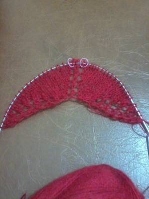 4 ряд 8лицевой)- 3 лицевые(кромочные петли),1 накид,далее лицевыми до центральной петли,1 накид,1 лицевая (центральная петля)1 накид,далее лицевые петли до 3 последних (кромочных) петель,1 накид 3 лицевые (кромочные петли) (всего на спицах 17 петель)