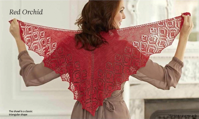 Треугольная шаль от Anniken Allis идеально лежит на плечах. Кружевной узор, напоминает цветение экзотических орхидей, образует волнистый нижний край. Благодаря мерцающей шелковой пряже Skein Queen ты почуствуешь себя в этой шали особенной.
