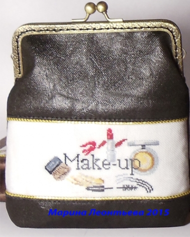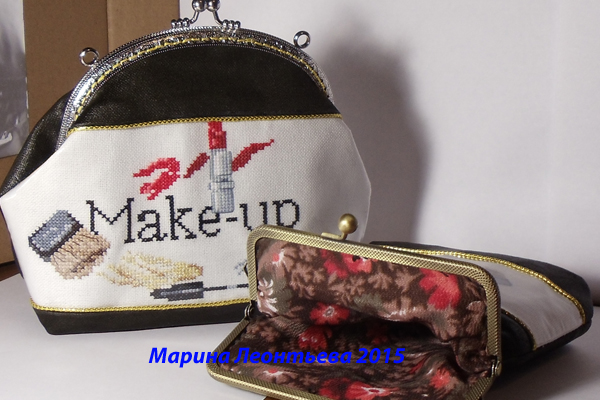 Итак, давно уже хотелось попробовать поработать с фермуаром, но останавливало именно то, что шитье это не мое. Тем не менее, как говорится ,«охота пуще неволи»)) приобрела я два фермуара, один полукруглой формы, другой прямоугольной. Сразу было решено сделать две косметички. Тем более дизайн выбран был уже давно. Это дизайн из книги Вероник Ажинер «Вышивка крестиком для настоящих модниц», а так же мне воочию хотелось посмотреть, как будет отличаться один и тот же дизайн при вышивке на равномерке через одну и через две нитки.