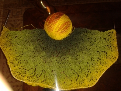 Вот теперь я довольна! Получается шаль, а не накидка, Так что ниточки надо брать шальные, а не носочные!:))). У меня Кауни8/1. Спицы 3,5. Можно было бы и потолще спицы (надо будет прикупить...)