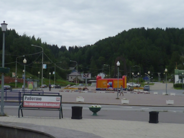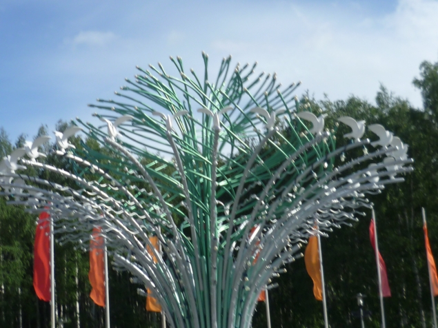 У церкви начинается деревянная лестница, ведущая на самую высокую точку города. Не счесть, сколько раз на этот холм поднимались ханты и русские для осмотра окрестностей. Поднимаемся и мы. Теперь над Иртышем, посреди тайги, над обрывом, в окружении могучих кедров высится небывалое для здешних мест сооружение. 62-метровая стела «Первооткрывателям земли Югорской» царит над городом и окрестностями. На каждой из трех ее граней - тематическое рельефное панно: о народе ханты-манси, о казаках-землепроходцах и о героях-нефтяниках. По идее архитекторов эта стела должна напоминать хантыйский чум, смотровую казачью башню и нефтяную вышку. Но больше всего она похожа на египетскую пирамиду, волей судеб перенесенную с берегов Нила на берег Иртыша. И выражает, по сути, ту же идею, что египетские памятники - идею "покорения земли". И поражает своим размером и местоположением. Хорошо бы взглянуть с этой пирамиды на окрестности, но не суждено. Но и с 80-метровой вершины холма нас поражает открывшаяся панорама сибирских просторов с бескрайней и пустынной равниной, с могучими реками, с ветром и солнцем. Собственно говоря, это и есть главное достоинство города как центра туризма, то самое, за чем стоит сюда приехать. Это Сибирь. И это Россия.