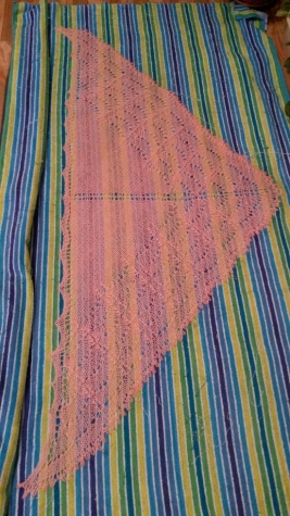 На шаль Персик ушло 70г пряжи Нако мохер с акрилом, спицы 3, бисер 8 немного темнее ниток. Размеры шали 145 см на 70 см. Шаль на блокировке
