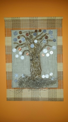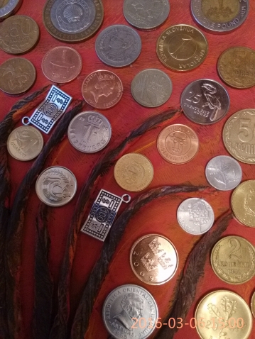 Моя работа выполнена на стекле, раскрашена акриловыми красками, монеты из собственной коллекции.