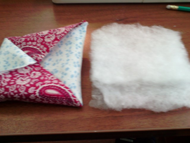 (конвертик получится, пока что на изнанке) и прошила несколько сантиметриков с угла к середине, оставив для выворачивания немного и потом вывернула! Тогда запихиваем синтепон в прорешку пинцетом и подворачиваем внутрь припуски, зашиваем прорешку!