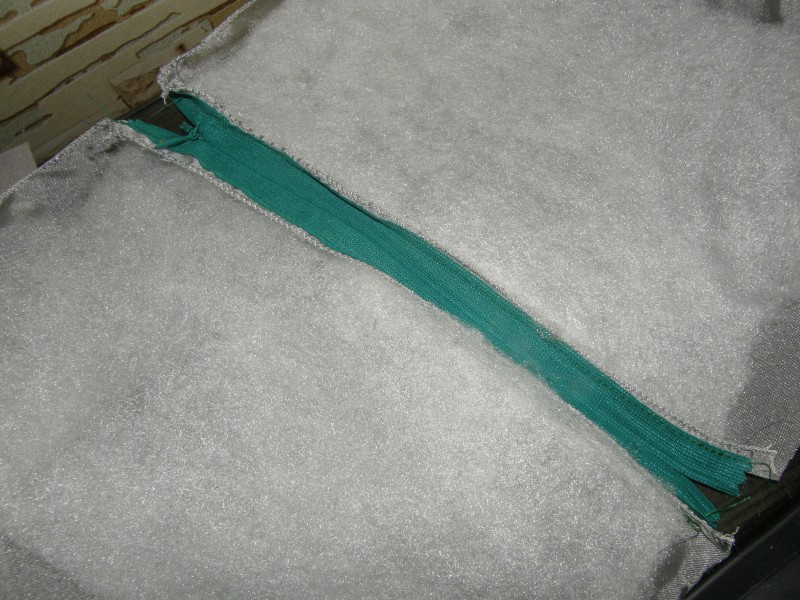 теперь приступаем к пошиву внутренней части, берем синтепон, ткань и молнию (молнию в процессе работы я тоже решила заменить на зеленую)
