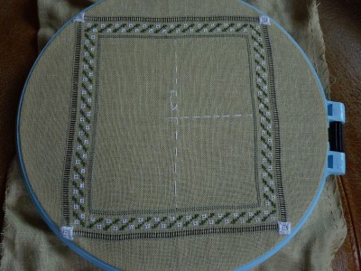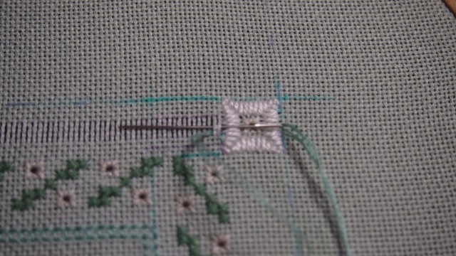 Вышиваем стежками (FOUR-SIDED) нитками мулине ДМС 503(в 2 нити) или 503 pearl cotton#12.Объясню почему! Внешняя сторона рамки вышита мережкой на продернутых нитях и если мы ошибемся хотя бы на одну ниточку,то загубим всю нашу работу и материал, а так мы сможем исправить ошибку.
