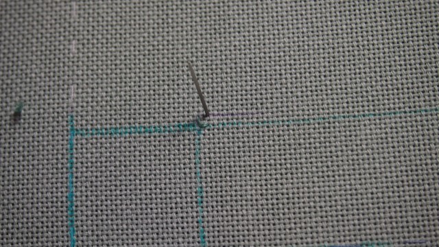 От размеченных контрастными нитками меток по вертикали и горизонтали отсчитываем 26 нитей ,затем поднимаемся на две нити вверх и вышиваем цепочку.