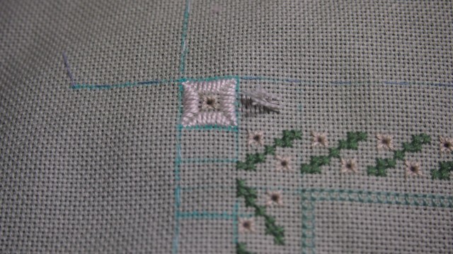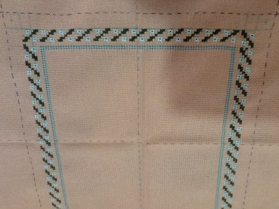 Далее нам надо по углам внешней рамки вышить четыре медальона. От нижней разметки по горизонтали и вертикали во внутрь отсчитываем по 12 ниточек,получается квадрат.Находим середину. От середины поднимаемся на 4 нити вверх и вышиваем три стежка на 4 нити, затем один стежок на 3 нити,и по убывающей на 2 нити и на 1 нить ,нитками pearl cotton #8 цвет Ecru. И так вышиваем все четыре стороны квадрата.