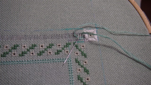 Продергиваем ниточки и на получившейся дорожке нитками мулине ДМС 503(в 2 нити) или 503 pearl cotton#12 вышиваем мережку.