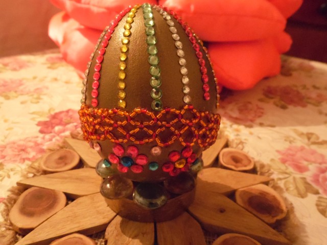 Немножко бисер отклеился, но я всё поправлю и обязательно поставлю себе на полочку!!! На фото совершенно иное впечатление, на самом деле оно просто "играет" блеском страз и камней!