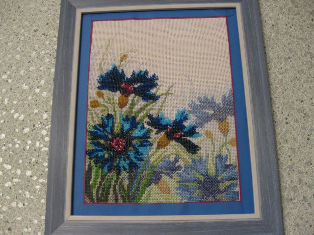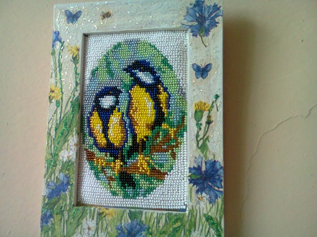 Когда увидела картины для вышивки бисером,была настолько очарована ими, что решила попробовать. Но для первого раза купила красивую картинку,но не совсем лёгкую в исполнении. Вышивка была в смешанной технике, квадратных пялец у меня не было,а в круглые с бисером не вставишь . Вот и пришлось сначала вышивать нитками ,а потом уж бисерные участки.Морока с подсчётом была. Да и нитками я вышивала до этого лет 40 назад. Затем оказалась проблема с оформлением. В багетной мастерской запросили такую цену,что можно ещё пять картин купить . Пришлось самой паспарту доделывать . А потом понеслось,как на тройке лошадей,картина за картиной. Оторваться не могла,прибегала с работы и скорее за вышивку. Сейчас тоже в работе есть вышивки,но больше времени уходит на вязание,да и кот любимый не дает вышивать,с бисером играет.