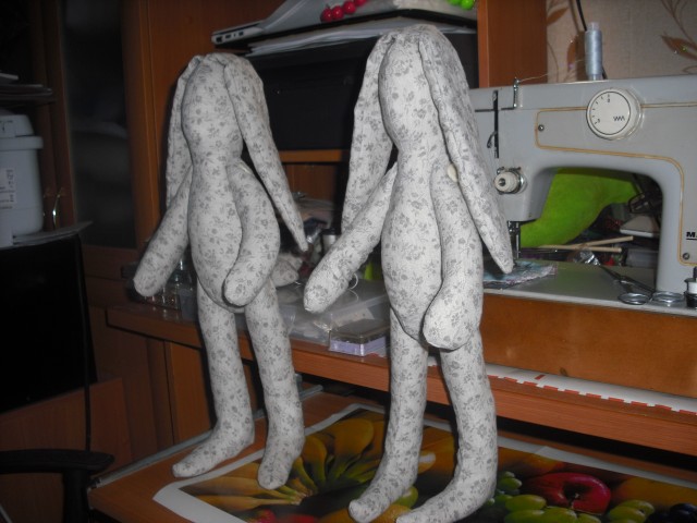 Доброго времени суток! Хочу первый раз поделиться тем, что выполнила своими руками. Я занимаюсь почти всеми видами рукоделия, вязание на спицах, вязание крючком, вязание макраме, бисероплетением, пробовала работать с полимерной глиной и другими видами но в этом году впервые попробовала шить игрушки. На Новогодние праздники сшила несколько обезьян из носков. Конечно идеи подсмотрела из интернета. А теперь решила сшить зайцев. Одного зайца сшила в подарок, а остальных для своего малыша. Зайцы самостоятельно стоят, могут сидеть, ростом 40 см. Есть планы освоить пошив текстильной куклы с рисованным лицом. Надеюсь, судить будете не строго...