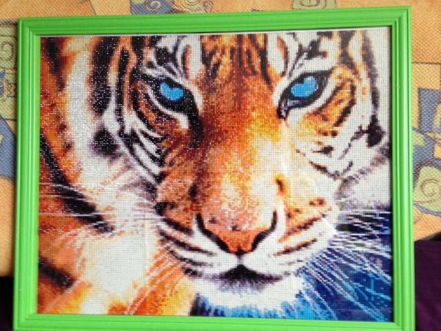 И снова тигр(алмазная вышивка).Я очень недовольна этой работой. Пришла в посылке вся изуродованная!!! Это видно и Вам. Отглаживали, разглаживали т.д.-бесполезно. Но я этого бедняжку очень люблю. Отвезу на дачу "дом сторожить".