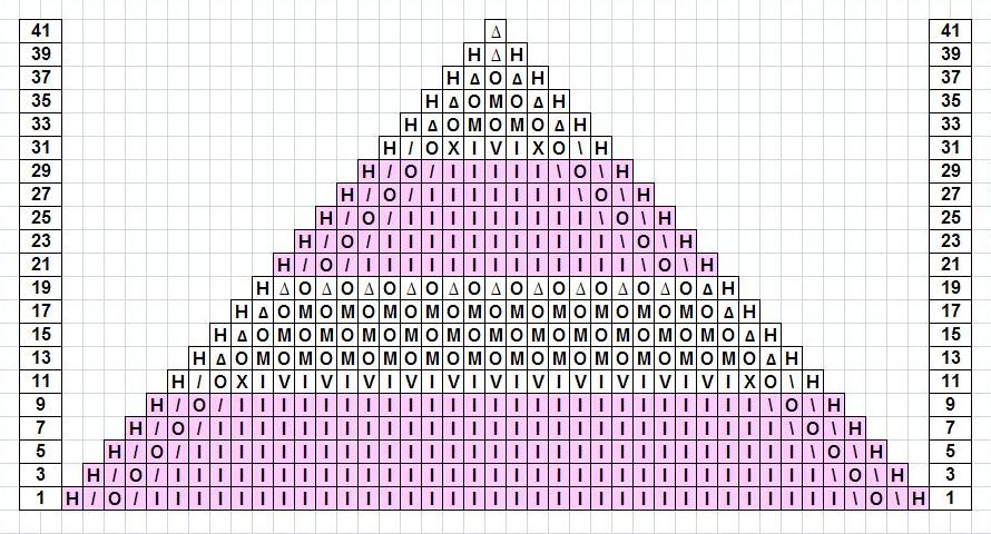 Повторяйте ряды 1-20 Схемы 2, пока боковые стороны треугольника не достигнут 95% от требующейся ширины палантина (см. фото ниже).