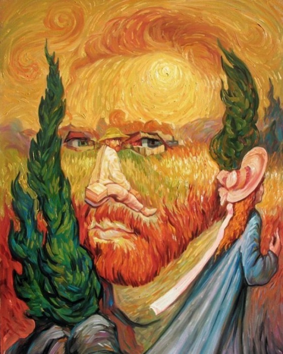 Придавать картинам двойной смысл художнику нравится едва ли не больше, чем заниматься обычной живописью. В работах Олега Шупляка прослеживаются элементы сюрреализма, абстракционизма, символизма.Образ Льва Толстого. Оптическая иллюзия.