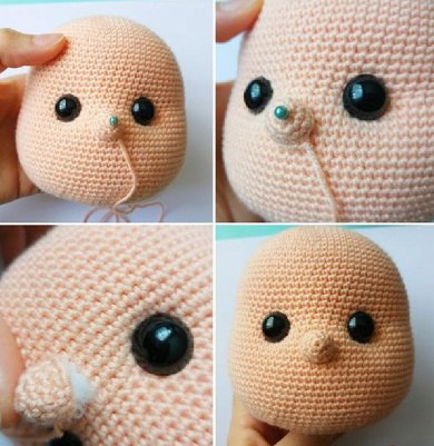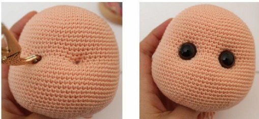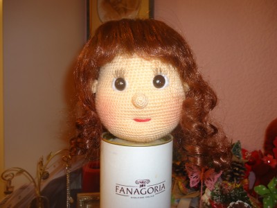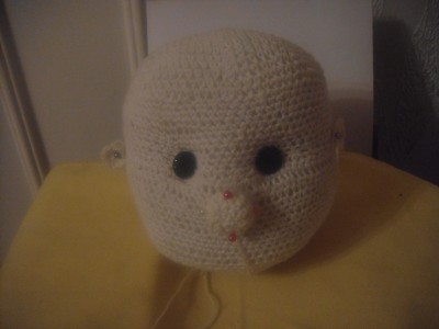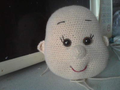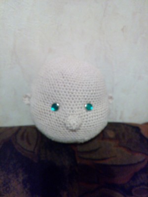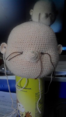 утяжка получилась маловата; глазки у меня с креплением, пока их вставляла утяжка стала поменьше, утяжку пришлось делать после 49 ряда, уши мне показались маловаты, добавили ещё ряд СБН. волосы пока делать не буду. Так как делает Тина, голова получается тяжелая, но видимо кукла будет на каркасе, поэтому буду эксперементировать позже