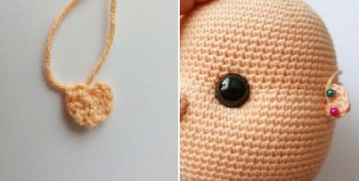 Пропускаем 1-2 петли и вводим иглу в головешку и выводим ее из левого глаза,также пропускаем 1-2 петли и вводим нить в голову,и выводим ее из головки из открытого отверстия.Стягиваем нить.Делаем узелок побольше на нити.Чтобы наша утяжка сохранилась
