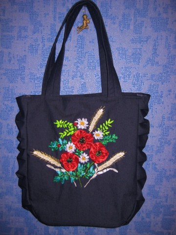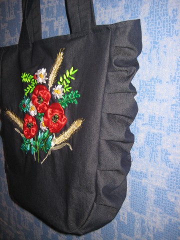 Моя первая сумка с вышивкой. Очень хотелось попробовать вышить лентами маки и ромашки и конечно колоски. Вот попробовала и сделала сумочку. Настоящих мастеров вышивки прошу не смеяться, первый раз, как в первый класс.
