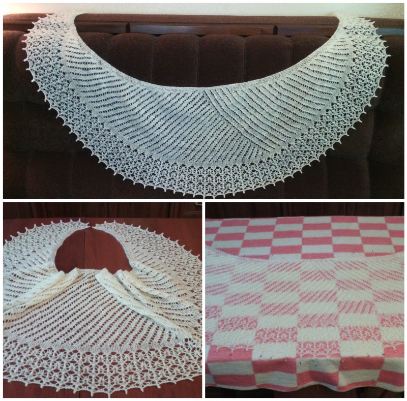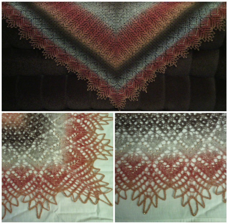 2.Вариация на тему "Падающиего собора". Тело как в предыдущем варианте, кайма - часть каймы взяла от "Мазурки" Татьяны Гобрусевой. Пряжа та же рассказовская, размер и вес почти как и в предыдущей шали. Кайму можно придумать любую!
