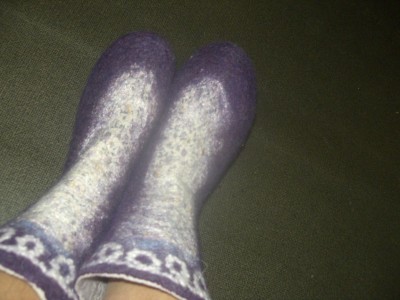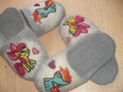 Одна моя виртуальная подруга, которая два года назад заказывала у меня грелку на чайник к Новому году в виде тогдашнего символа - козочки, обратилась на днях с просьбой: хочет положить под елочку для своей четырёхлетней дочурки красивые тёплые тапочки. Расспросила я её об увлечениях дочки и порешили мы с ней украсить тапочки мотивами из мультиков про пони. На фото кажется, что тапочки большие, но это совсем не так - длина подошвы 17 см. Трудность состояла в том, чтобы выбрать рисунок, который бы смотрелся на небольшой площади верхней части тапочка, был "узнаваем" и не "размазан". Перебрала кучу вариантов. В процессе работы сломала 4 иглы (выписала на ЯМ,очевидно угодили китайского производства). Но сделала-таки. И, на мой взгляд, не совсем плохо. Вот,выкладываю свою работу на ваш суд.
