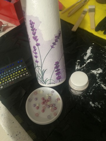 5. далее, я хочу запылить акриловой краской (жемчужный перламутр) и декорировать бутылочку полубусинами