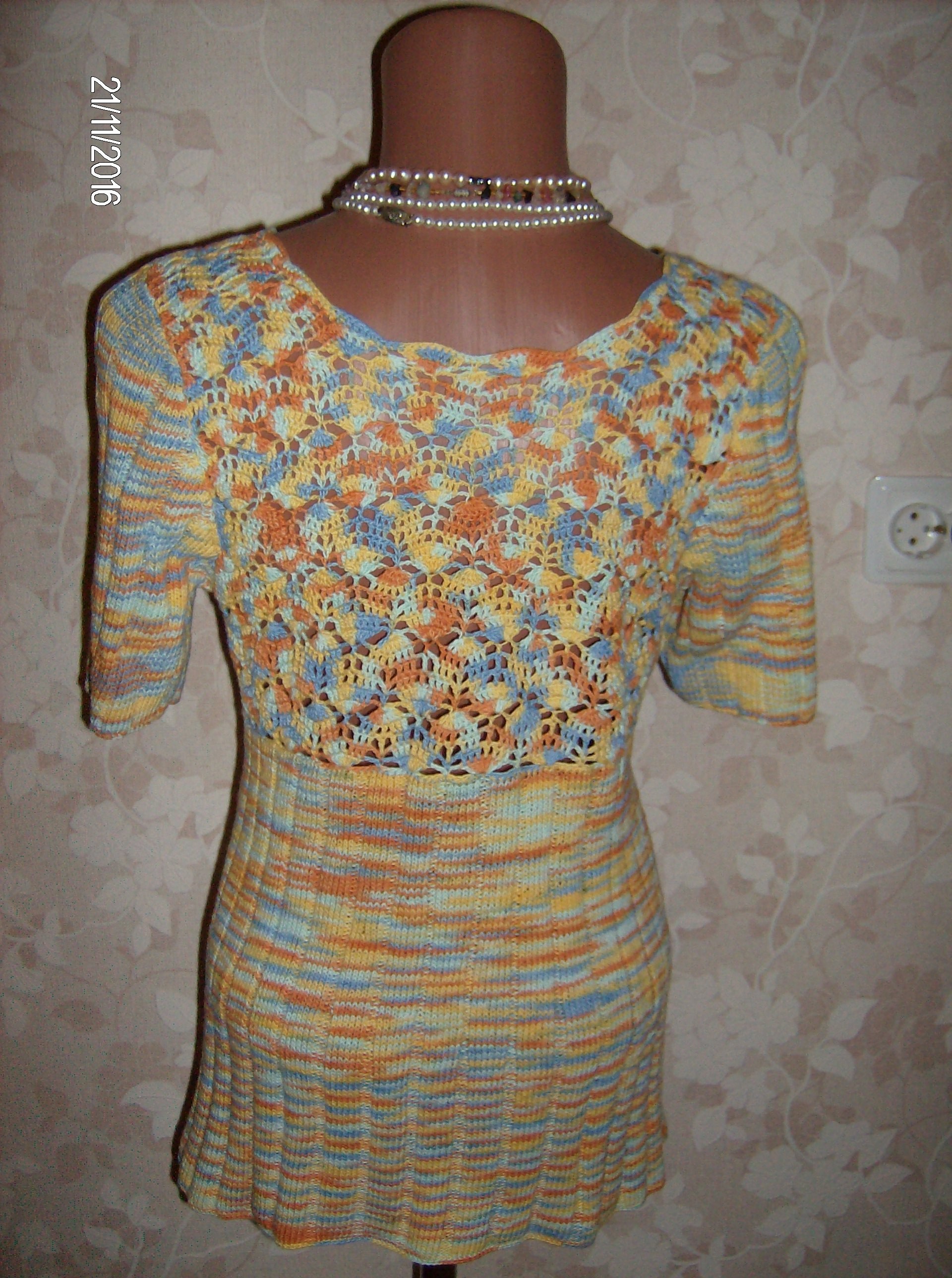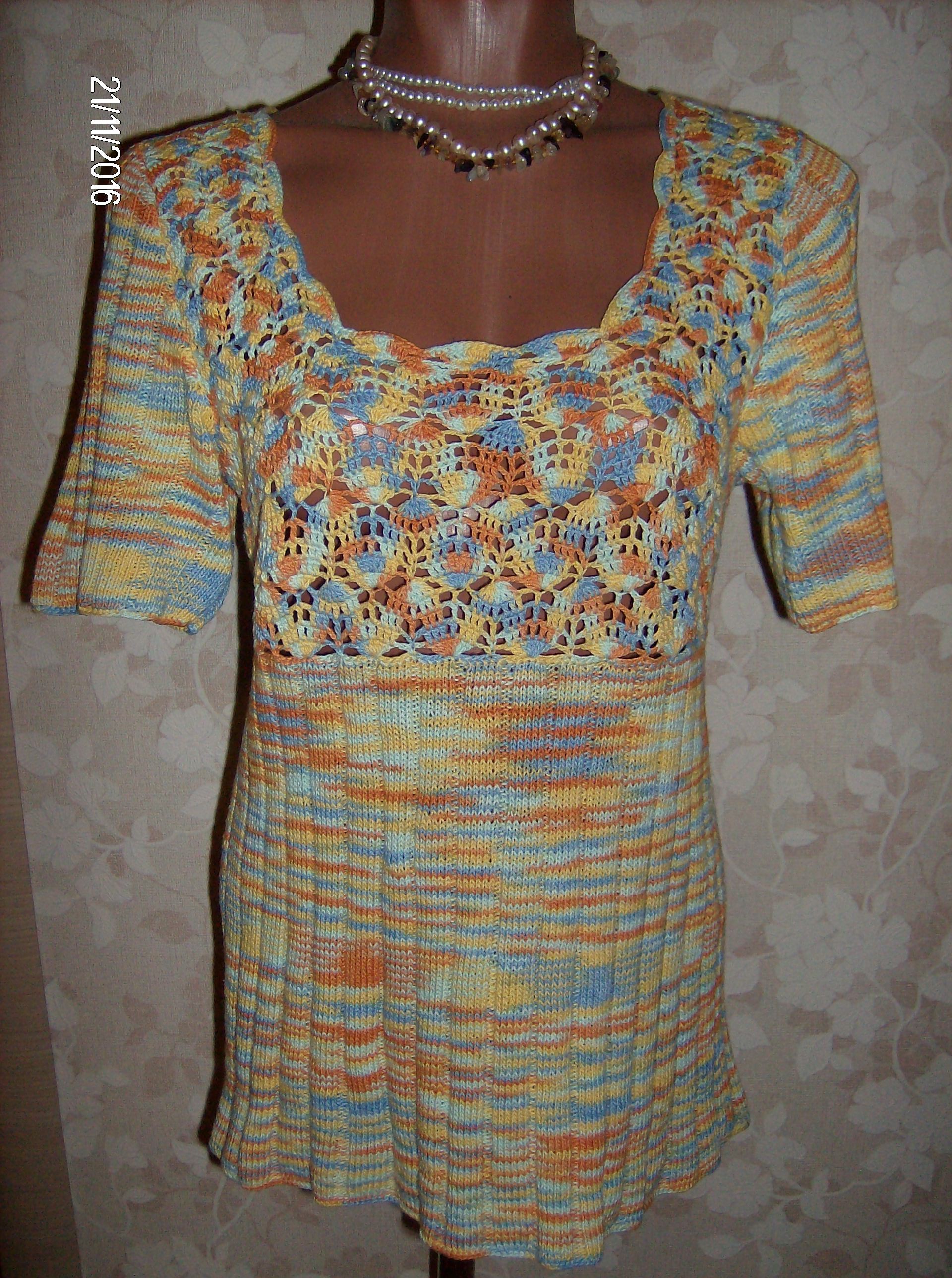 Уважаемые форумчанки, добрый день! Представляю кофточку, связана давненько, ношу часто, очень нравится, нитки (хлопок, названия не помню), правда, были в использовании, распустила, связала снова. Приношу свои извинения, схему вязания лифа не нашла, помню, что брала из интернета, видимо, не сохранила, утилизировала. Лиф вязала снизу вверх, сшивала, затем набирала петли по низу лифа и вязала сверху вниз резинкой 5 лиц., 2 изн., постепенно прибавляя, закончила 6 лицевыми, 3 изнаночными
