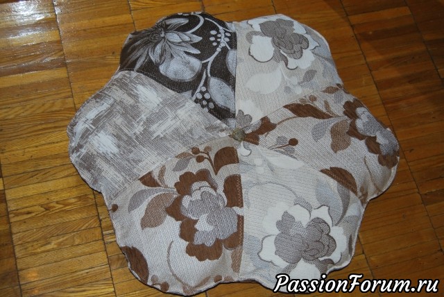 Подушку сшила из лоскутов обивочной ткани.Работать с ней трудно-очень сыпучая.Да еще я перепутала лицо-изнанку и отшила всю зиг-загом-пришлось распускать и переделывать(получился долгострой).Размер подушки определился размером лоскутов-диаметр 68 см.Получилась подушка напольная,внучке играть-чтобы не на полу сидела