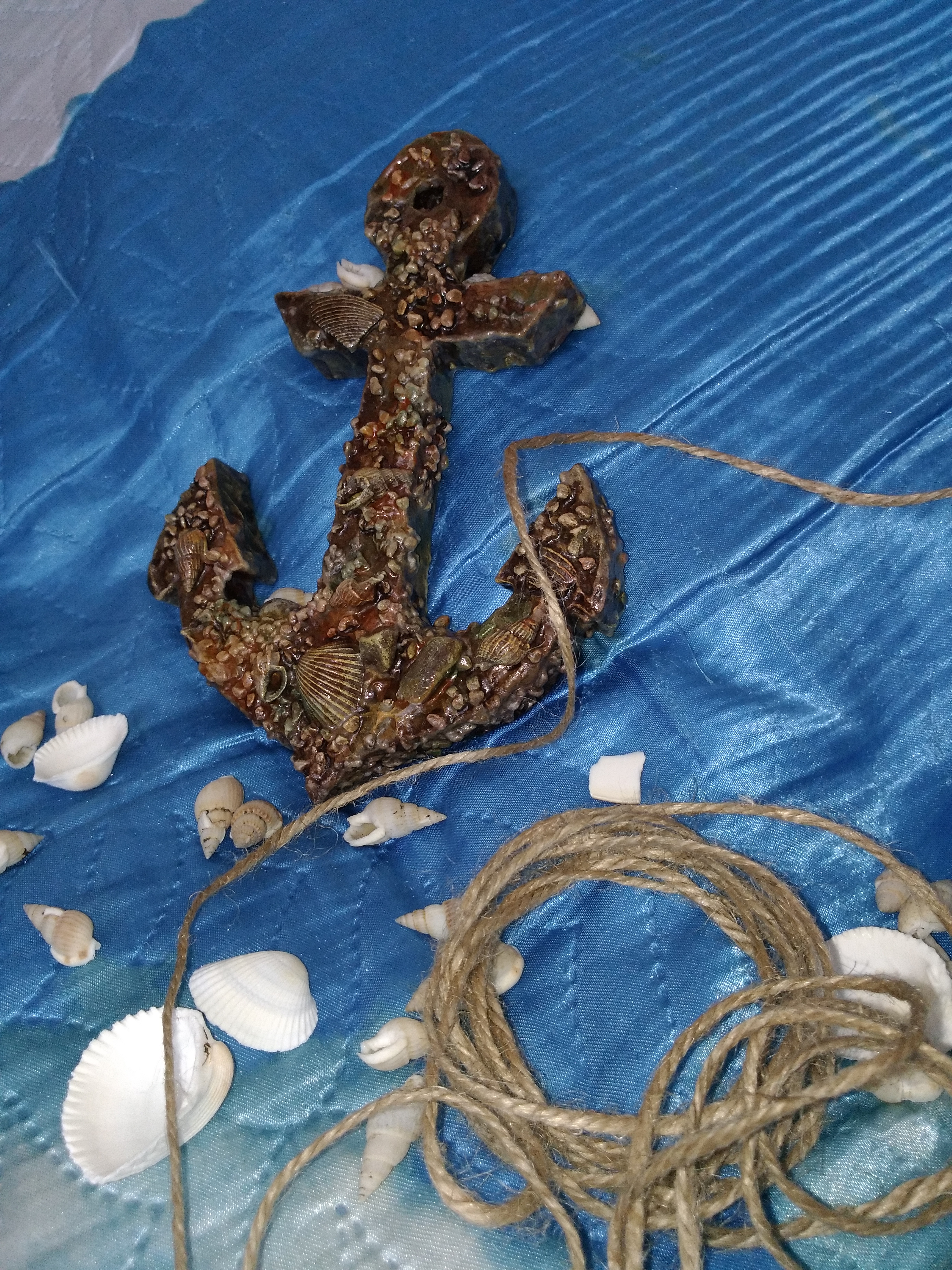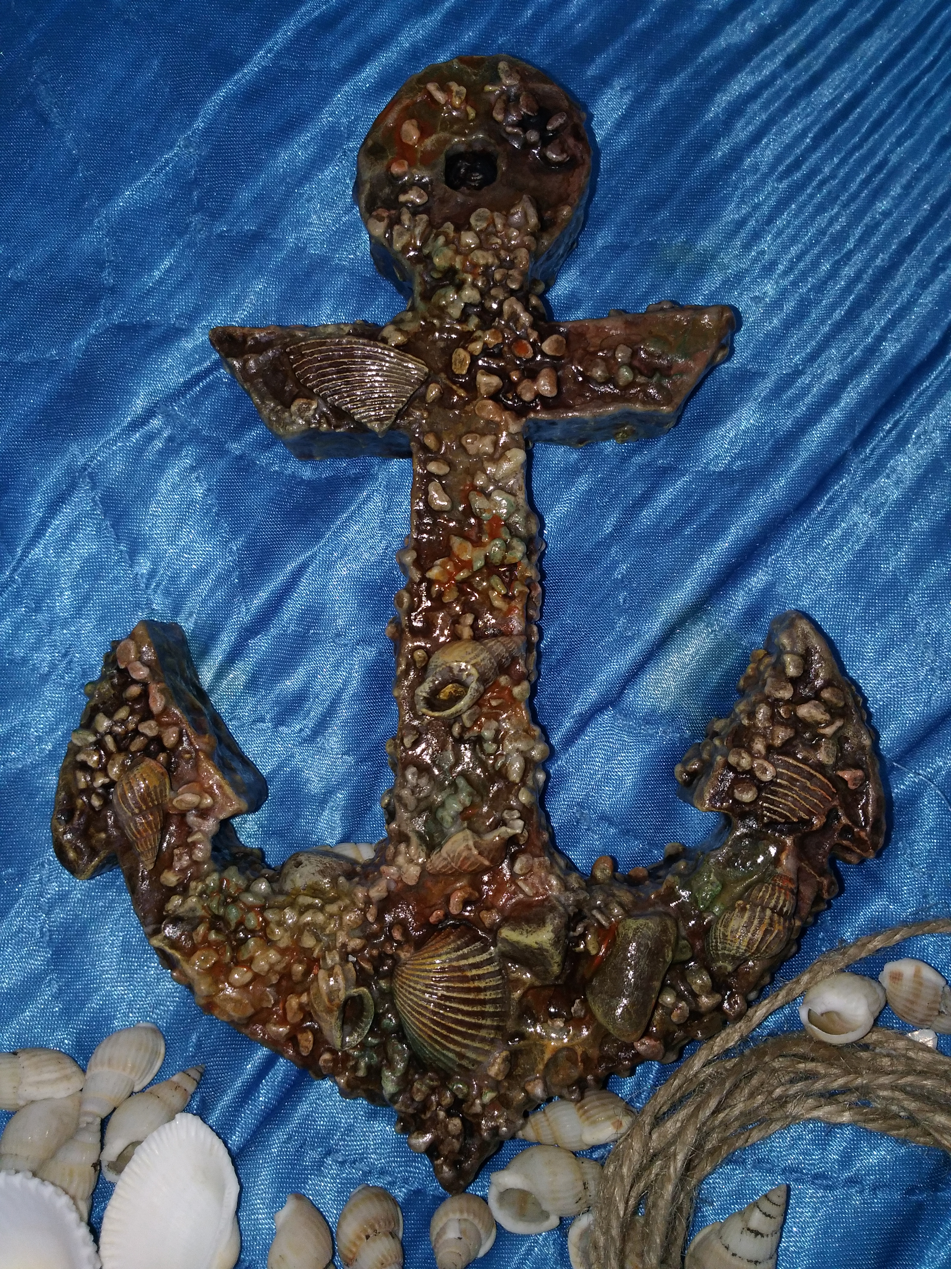 Сделала в подарок мужу, теперь весит на стене на работе. Заготовка из дерева.Шпатлевка, ракушки, камешки, акриловая краска.