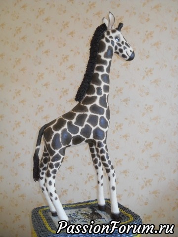 Дорогие форумчанки, хочу показать вам свою новую работу. Этого жирафа я сделала на заказ. Заказчица просила сделать его не мультяшным, а реалистичным. Техника, в которой он выполнен, отличается от той, в которой я делала все предыдущие игрушки. Совершенно не видно что он сделан из ткани и , также, не видно швов. А самое главное и очень волнительное для меня то, что это моя первая авторская игрушка. Поэтому, как говорят, не судите строго.