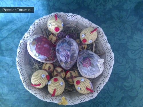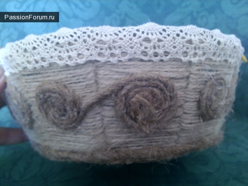 Благодаря идее Ларисы (Lori) у меня получилось такое лукошко. Не знала в какую рубрику его поместить, так как здесь и вязание крючком, и плетение шпагатом, и декупаж): Люблю работать с разными техниками в одном изделии. Критика принимается):