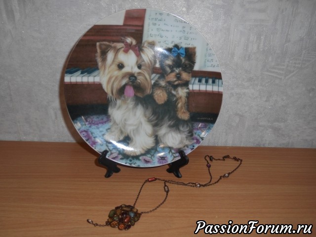 Это фото оставила напоследок...Тарелочка декоративная с собачками и кулон на цепочке.Фото не передаёт красоты кулона-камешки как-будто витражное стекло, скромно поблёскивают, цвета осенние, мои любимые....а в тарелочке совместились два моих"собирательства"-тарелочки и собачки.Свою коллекцию тарелочек я выставляла, а собак пока нет, т.к. они ещё не все в сборе.Всем спасибо за просмотр. А моей Фее и Организатору ОГРОМНЕЙШЕЕ СПАСИБО за доставленную радость мне и моей семье