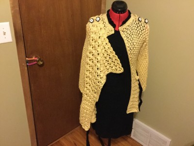 Ниточек пошло пять мотков по 275 метров,крючок 2,5 и огромное терпение вывести всю конструкцию по деталям к окончательному образу и пропорциям.Баска связана секторами из разных рисунков ,на пояске сделала петли и вдела друг на другав петельки пуговичку связанную из ниток .Рукава и подмышечные части полочек и спинки связаны рисунком Соломоновый узел в укорочённом варианте,я в прошлых топиках публиковала схему этого модернизированного мною приема узла.