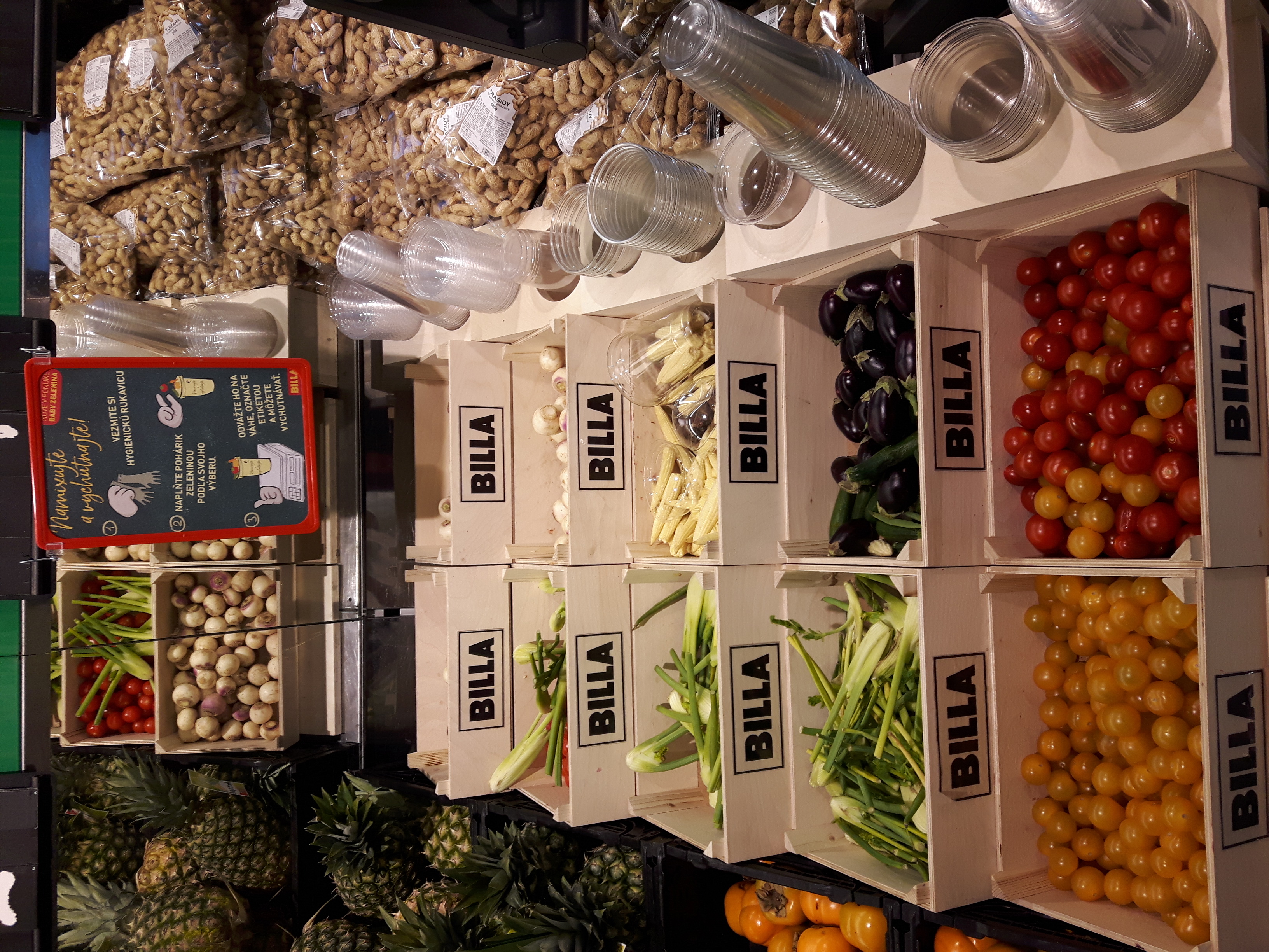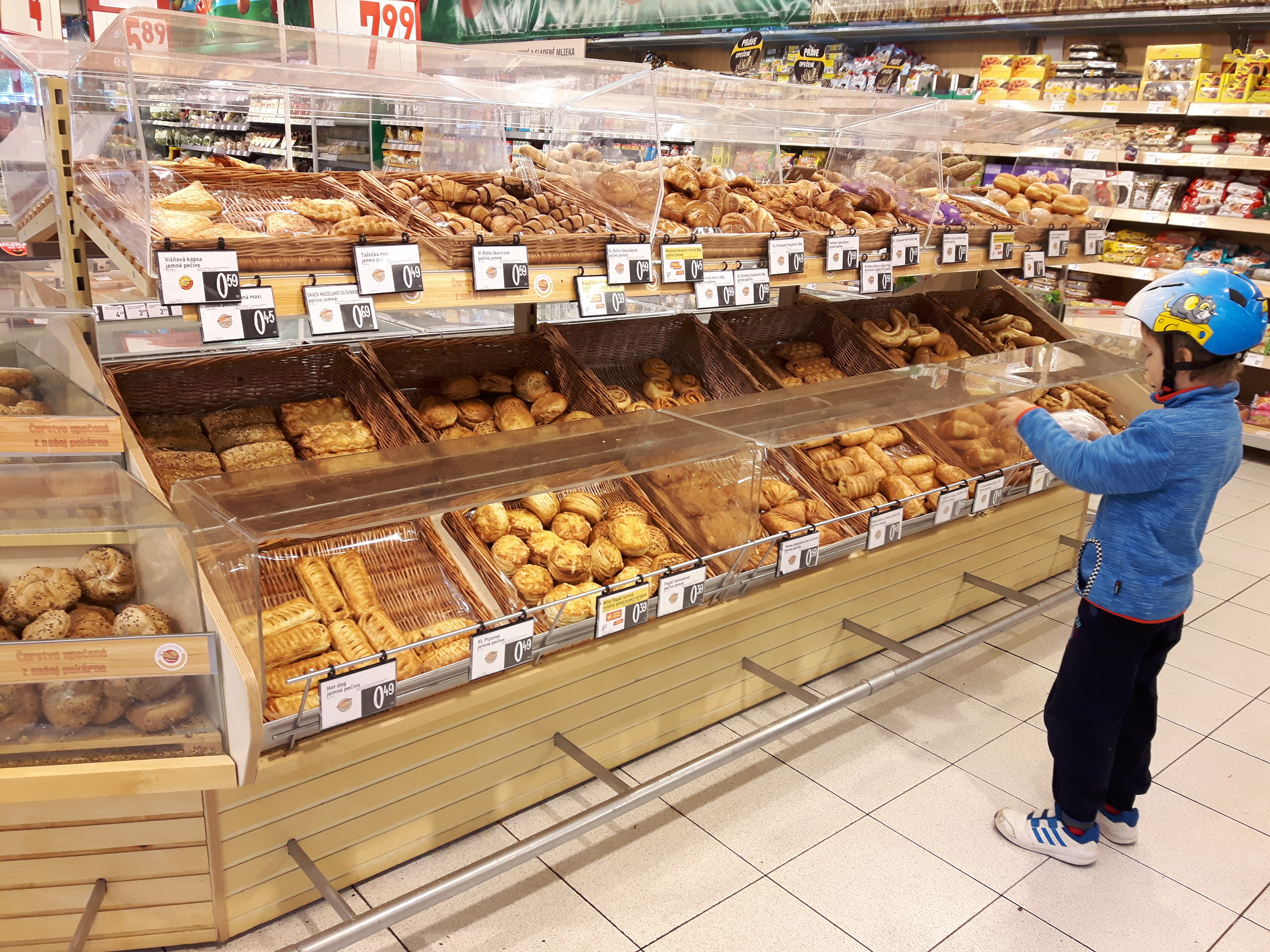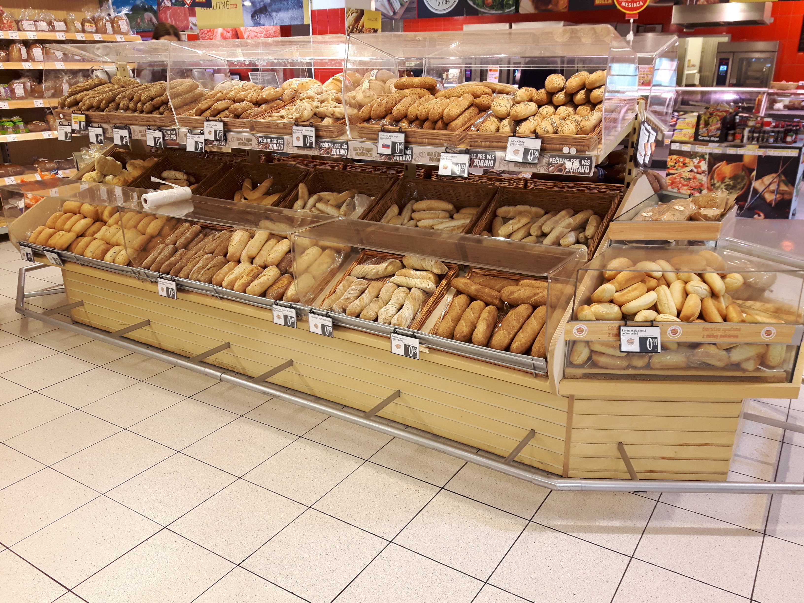 Пока сегодня покупала овощи, сфотографировала частично стеллажи овощно-фруктовые. Посмотрите, там есть такой светлый деревянный стеллаж, на нём мини-овощики. Такие милые, особенно баклажанчики. Они примерно 5-7 см в длину ;-))). Овощи все-все фермерские. Конкуренция на рынке огромная, поэтому каждый фермер-производитель дорожит своей репутацией ну и бьётся с конкурентами за "место под солнцем". Качество отменное! И ещё закину фото хлебо-булочных изделий. Словаки - большие любители мучного ))). Всяко разного пэчева (выпечки). Те овальные хлебные витрины, что на фото, они двусторонние и по бокам отсеки. Вот такие 3 огромных витрины в центре зала. А ещё хлеб расположен вдоль стен, на стеллажах. "И зачем столько углеводов поедать?", каждый раз я задаюсь таким вопросом ;)))))))...