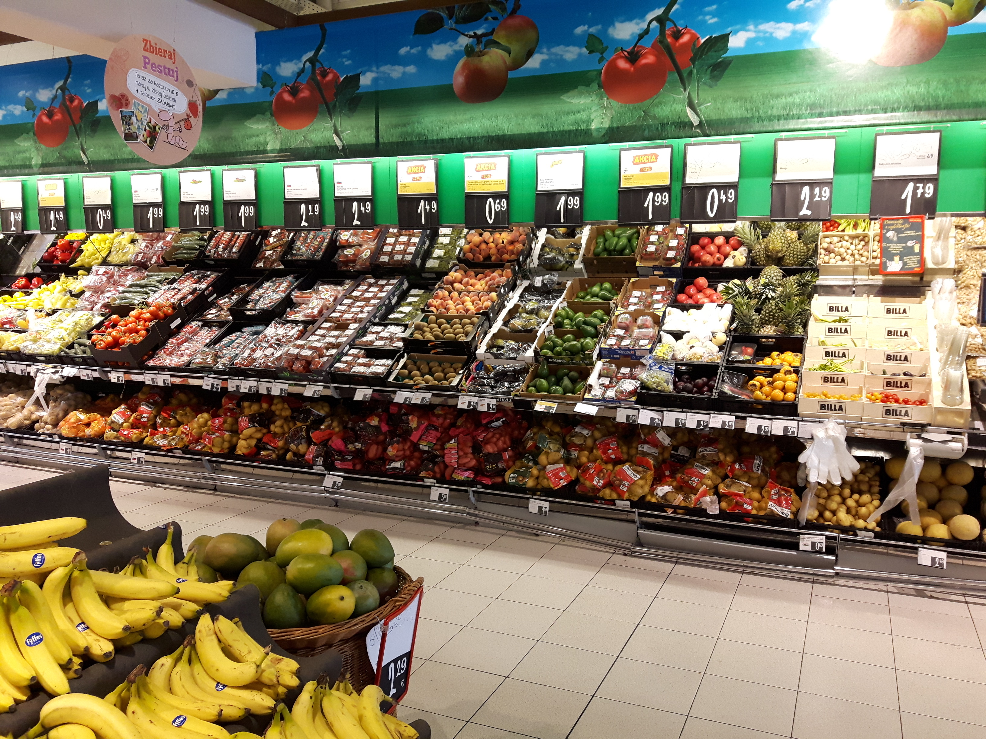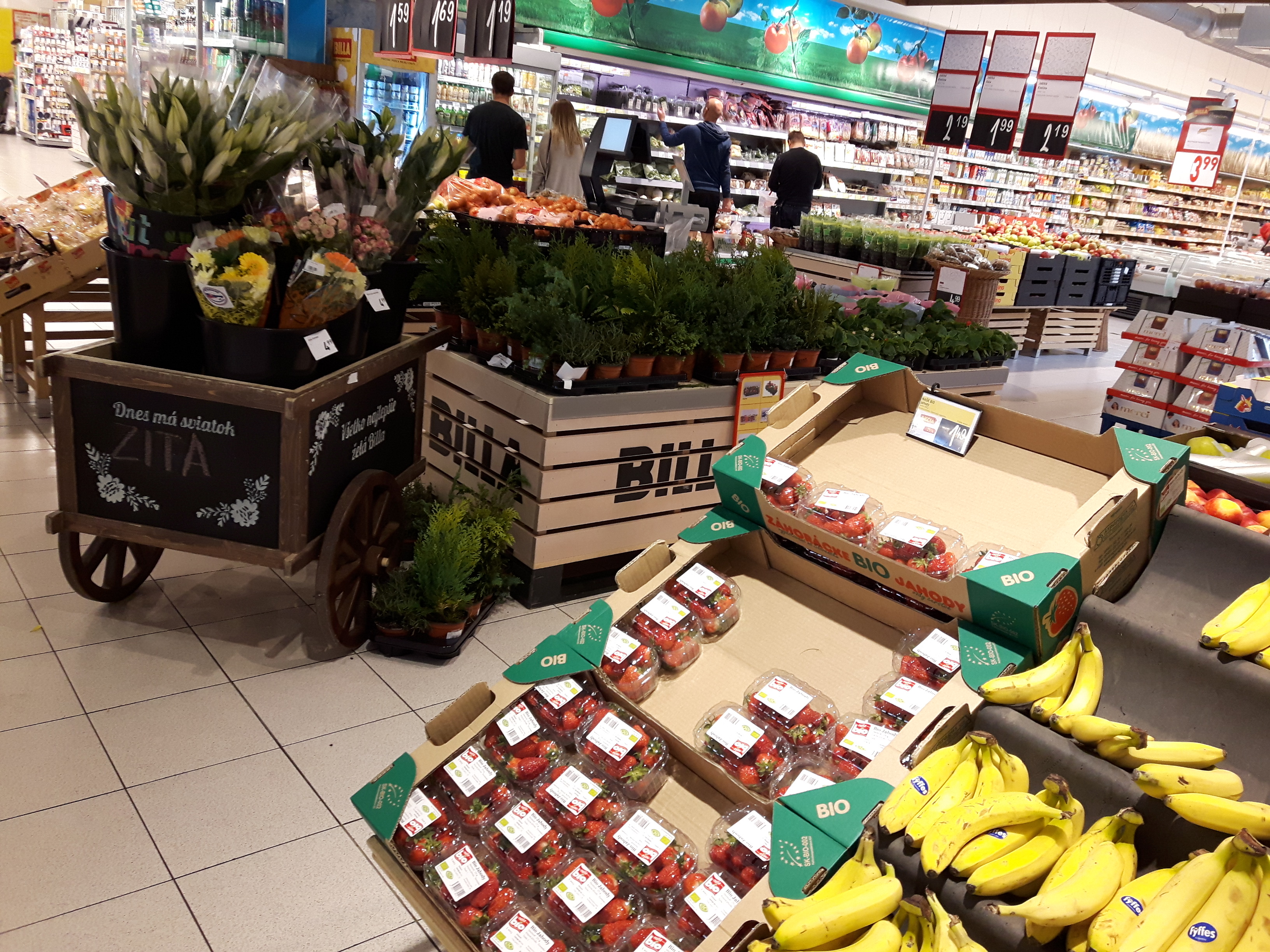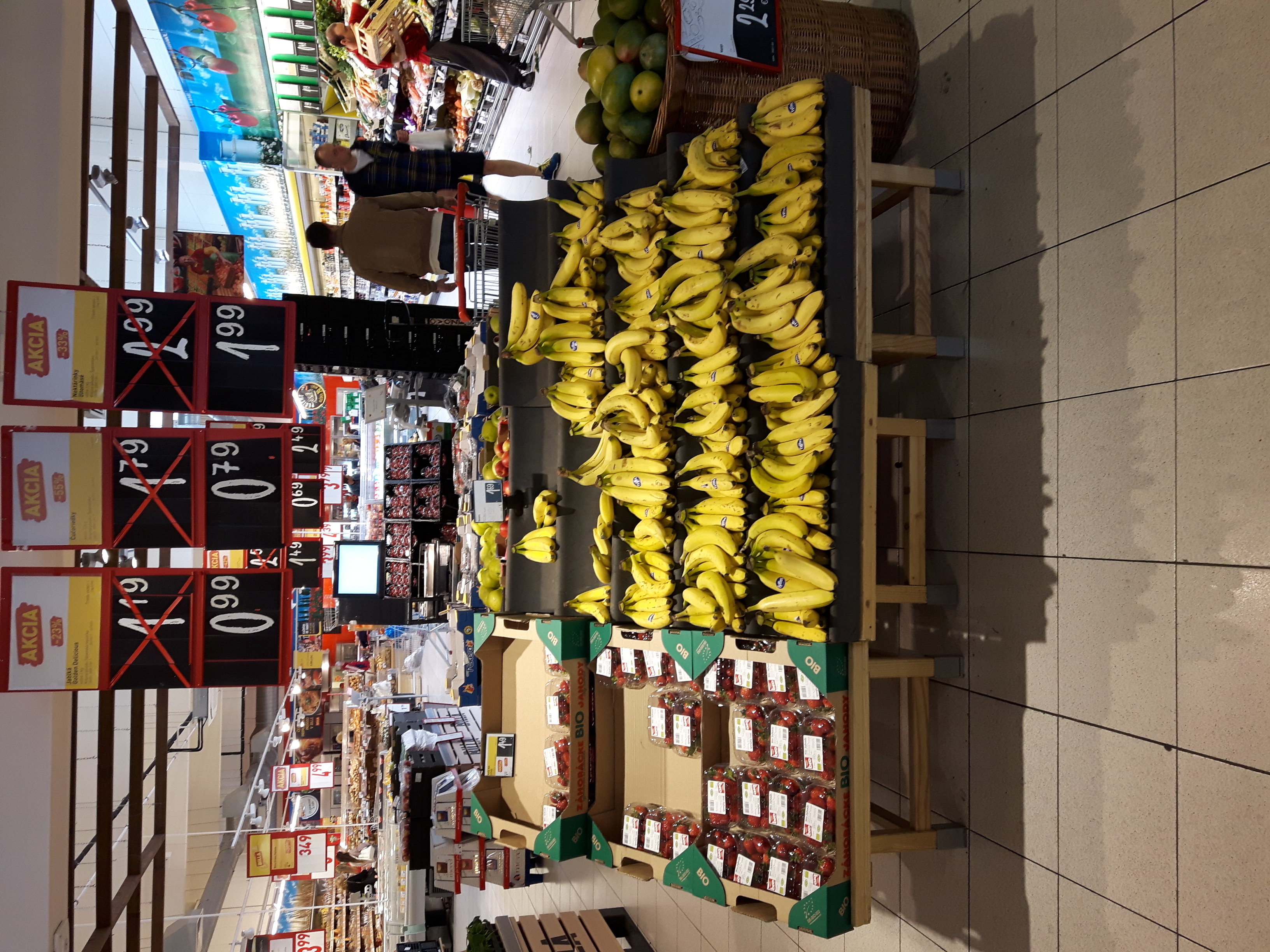 Пока сегодня покупала овощи, сфотографировала частично стеллажи овощно-фруктовые. Посмотрите, там есть такой светлый деревянный стеллаж, на нём мини-овощики. Такие милые, особенно баклажанчики. Они примерно 5-7 см в длину ;-))). Овощи все-все фермерские. Конкуренция на рынке огромная, поэтому каждый фермер-производитель дорожит своей репутацией ну и бьётся с конкурентами за "место под солнцем". Качество отменное! И ещё закину фото хлебо-булочных изделий. Словаки - большие любители мучного ))). Всяко разного пэчева (выпечки). Те овальные хлебные витрины, что на фото, они двусторонние и по бокам отсеки. Вот такие 3 огромных витрины в центре зала. А ещё хлеб расположен вдоль стен, на стеллажах. "И зачем столько углеводов поедать?", каждый раз я задаюсь таким вопросом ;)))))))...