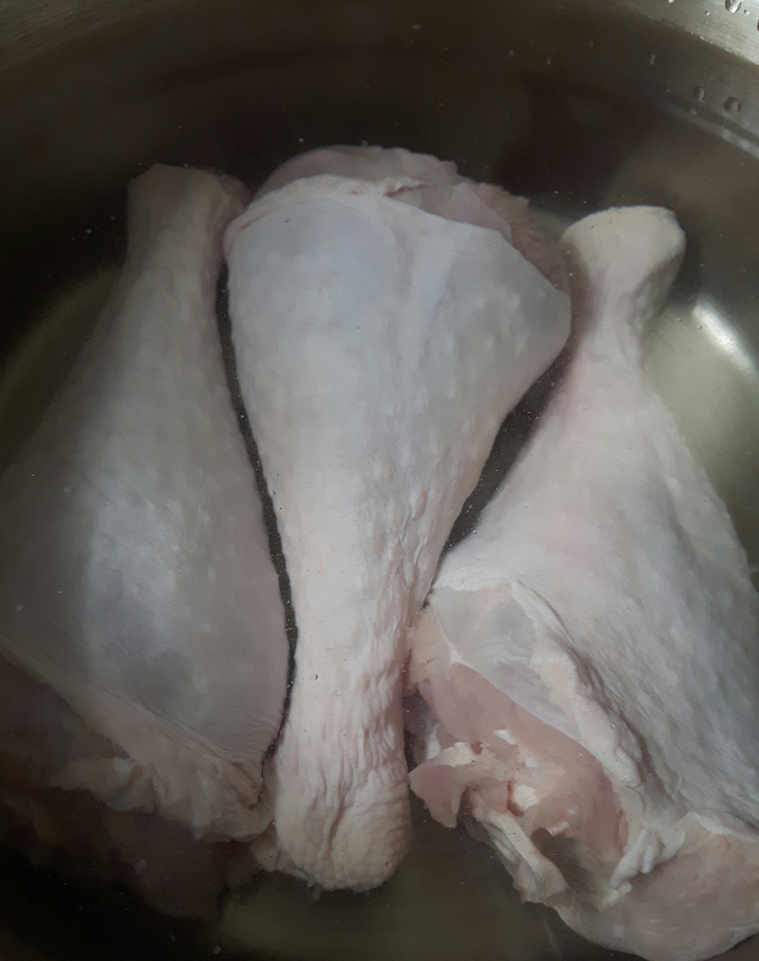 Я готовлю так... Обычно утром ставлю всё варить. Потом дела-дела и к обеду уже всё готово. Сначала собираю всю пенку долго и нудно, пока она совсем не исчезнет. Затем вынимаю бёдра. Процеживаю бульон, переливаю. Мою эту кастрюлю и в неё же , второй раз процеживая, переливаю бульон + бёдра..