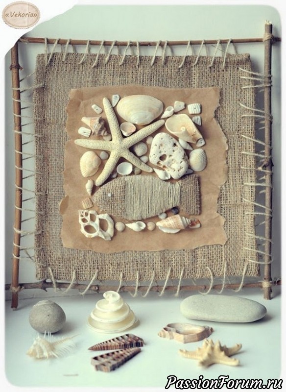 В первую очередь размещаем крупные детали.Их легко приклеить клеевым пистолетом, поскольку у них плоская основа. Маленькие и большие ракушки, расположенные раковиной наружу, надо внутри заполнить клеем, чтобы они хорошо держались на основе. Теперь приклеиваем камушки, пришиваем рыбке глазик-бисерину, и панно готово.