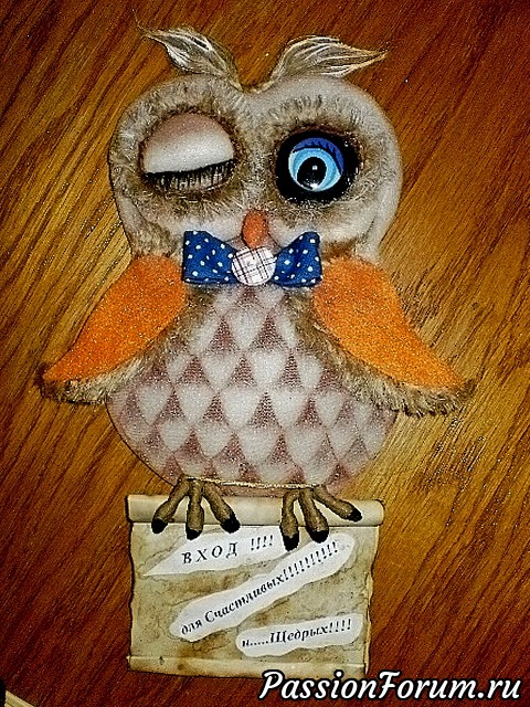 Вот такая Совушка на входную дверь,где есть глазик.там будет дверной глазок.И...заходите люди добрые. Если не хотите на дверь.то можно на холодильник.только написать на свитке другое.например "Куда лезешь.....после 6-ти!!!!".Высота самой совушки 18 см и +свиток. Стоимость 500 руб и + пересылка. Покупайте!!! И Ваша квартира будет самой гостеприимной. Всего хорошего.