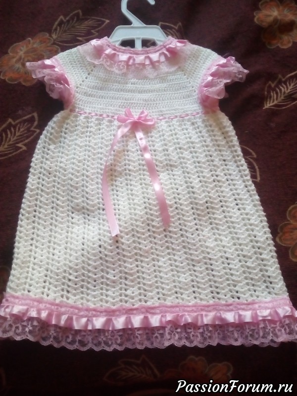 Хорошее платьице, только на мой вкус, лучше розовой ниткой было бы обвязать, а не кружевом, или без атласной блестящей ленты. Простите, просто не люблю блестючесть… сейчас довязываю наподобие Вашего платьица для своей внучечки.