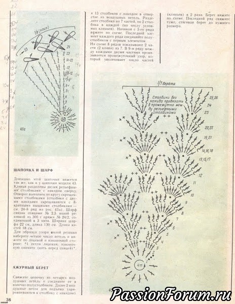 А на схеме под номером 44 знакомая мне шапочка, вязала в молодости из тонкой шерстяной пряжи в 6 нитей цвета слоновой кости. Очень теплая была, любила я ее. Журнал потерялся, кому-то одолжила. Кому — не могу вспомнить, вовремя не вернули. А сейчас бы снова связала, если бы схема была…