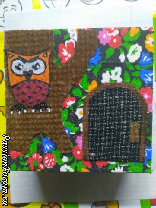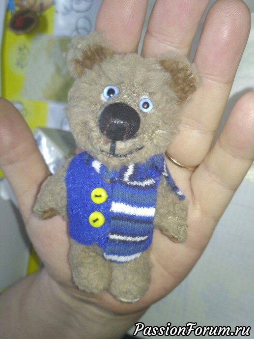сделан из кусочка плюшевого трикотажа .нашла в своих закромах.глаза- гвоздики, стеклянные.руки и ноги двигаются(стянуты толстой ниткой).одежда фетр,шарфик трикотаж.коробочку обклеила ситцем,сделала аппликацию на крышке.получился домик для мишки.сшила подушечку и матрасик.внутри нарисовала окно и сделала шторки.получился игровой домик.