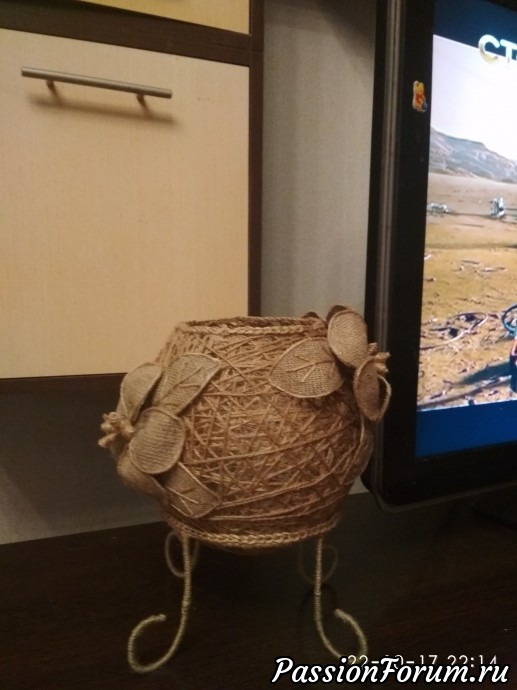 Спасибо. Да, это шпагатом был обмотал обыкновенный шарик, пропитан ПВА, потом шарик проткнули и вынули из середины, верх обрезали так как нам надо. Подставка сделана из проволоки, обмотанной джутом и приклеена к шару. Цветы сделаны из мешковины.