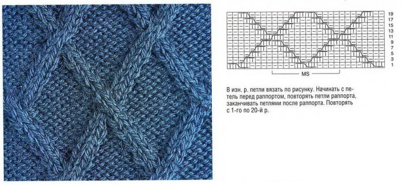 1 ряд: 2 изнаночные, * 2 изнаночные, 2 петли снять на вспомогательную спицу за работой, 2 лицевые, 2 петли со вспомогательной спицы провязать лицевыми, 2 изнаночные *;