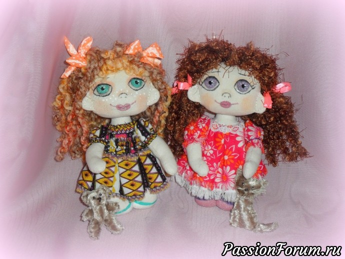 Здравствуйте,дорогие рукодельницы! Вот,сшила маленьких куколок и хочу показать вам. Ничего выдающегося,просто увидела в интернете таких малюток и,захотела сшить.Никогда не рисовала глаза куклам,а нарисовать надо.Да простят меня мастерицы кукольницы,глаза нарисовала зубочисткой и лаком для ногтей,так как никакой краски у меня нет.Получились такие вот две девчушки,которые мне пришлись к душе.Рост у куколок 15 см.,а у их игрушек-5см.Ну,посмотрите на моё произведение :-)