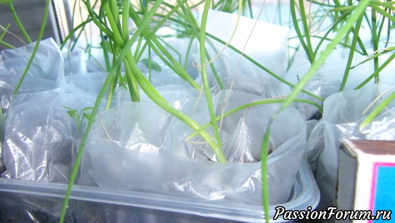 А эти посадки были сделаны чуть позднее. У них и перо 15 см, и вместо луковиц просто утолщение. Рассаду я пикировала в пеленки.