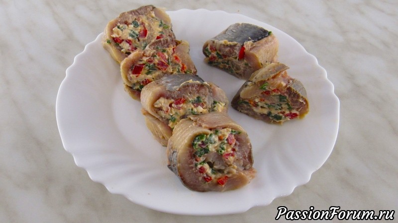 По истечению времени, рулет из сельди готов.Нарезаем его ломтиками при помощи острого ножа. Приятного аппетита!