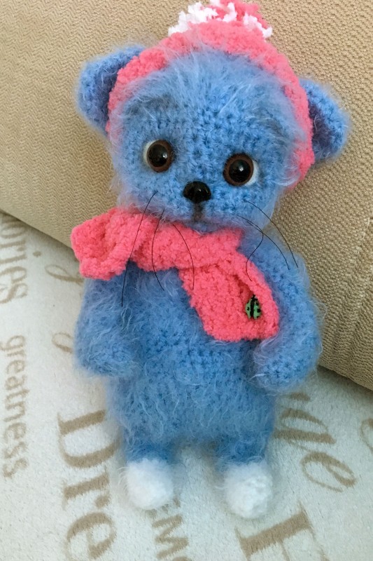 Котик вязаный крючком, на каркасе из медной проволоки, лапки и голова двигаются. Размер - 23 см. Носик и божья коровка из полимерной глины.