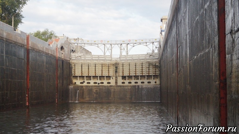 Мы заплыли в первый шлюз из двух. На фотографии плотина через Волгу и трасса М5.