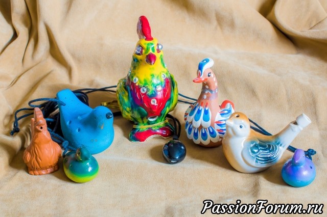 Добрый день всем! В нашем доме живет большая коллекция музыкальных инструментов. Может, вам будет интересно? Заодно и сама разберусь в ней и упорядочу) Сегодня первая часть - окарины. Это хорошо знакомые нам с детства свистульки. Глиняные игрушки в виде каких-то животных, рыбок, птичек. Но одновременно и простой музыкальный инструмент, на котором с легкостью чирикают дети.