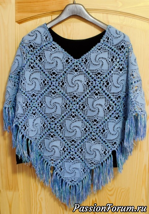 Здравствуйте дорогие рукодельницы! Начну с того, что когда-то, лет 7 назад, связала себе летнюю голубую кофту мотивами "мельница". И вот результат мне совершенно не понравился. Конечно, свернула я эту кофточку и пролежала она долго, ожидая своей участи. В этом году, благодаря подсказке Марины https://www.passionforum.ru/users/12004, за которую я ей очень благодарна, немного изменив мотивы и форму их соединения, связала летнее пончо, которое вам и показываю. Схему мотива не помещаю, уж слишком он известен...